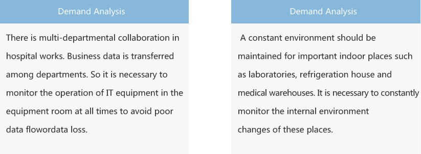 The importance of hospital is known to everyone as it isa guardian unit for people’slife safety.Special storage warehouses such as computer rooms, operating rooms, laboratories, refrigerationhouse, medical warehouses, etc. are importantplacesfor hospitals. These sites’ normal operationshould be guaranteed.Thus an integrated monitoring solution that can monitor the operation status of these sites at any timeis very necessary.